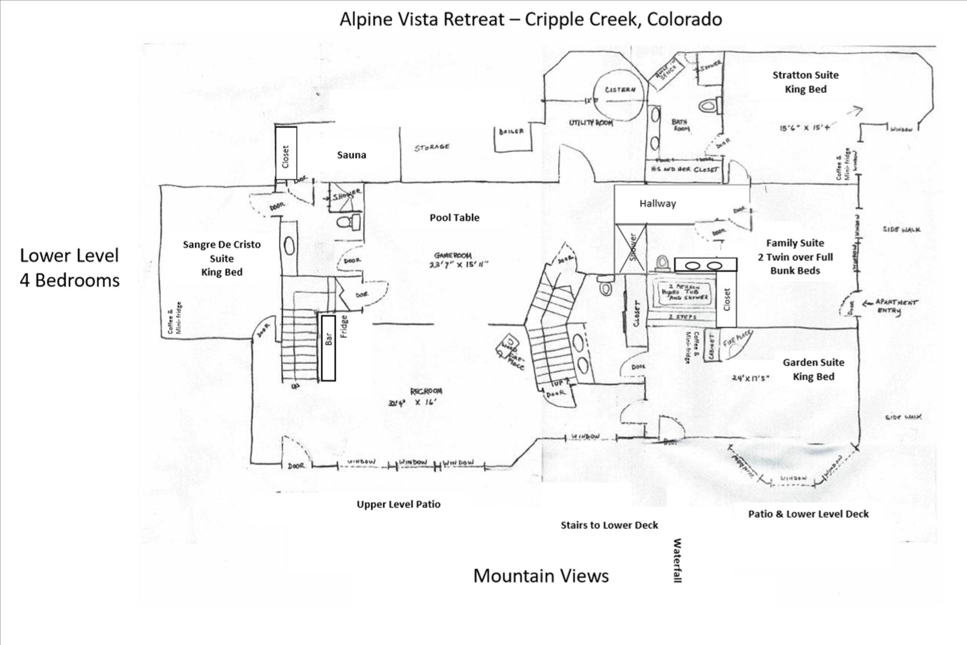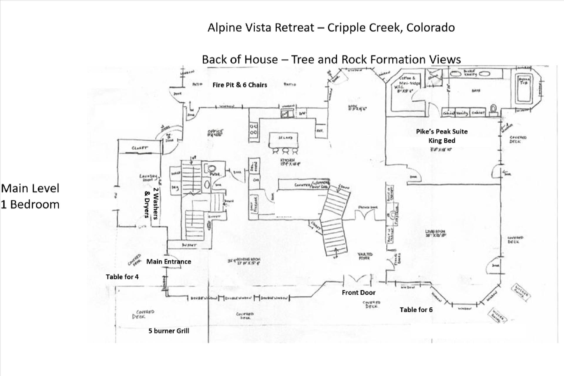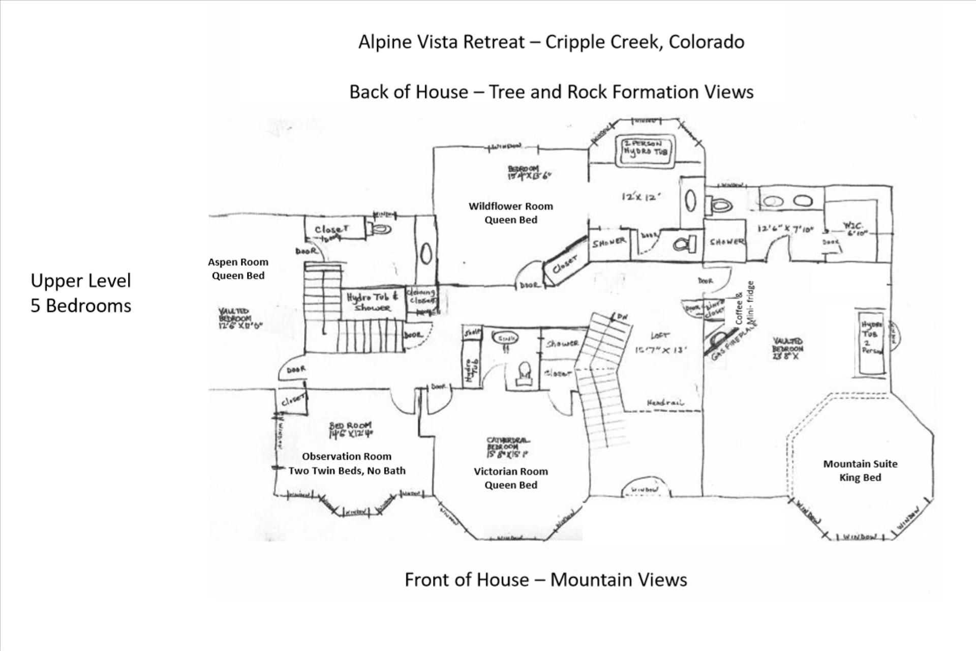 Alpine Vista Retreat is Cripple Creek's largest and most luxurious vacation rental. Built in 2003 as a Bed and Breakfast, each guest suite has a full attached bath with a hydrotherapy tub in most. We are no longer a Bed and Breakfast facility but the layout provides our guests with considerably more privacy and a much higher-quality experience than other vacation rentals. From the deck and most windows, guests enjoy unobstructed views of the Sangre de Cristo mountain range and with 8500+ square feet of living space and 27 contiguous acres, the property can accommodate virtually any group from family reunions, weddings, corporate retreats, conventions, hunting/fishing parties, etc. The property also features over 7000 square feet of outdoor living spaces including covered decks, large patios with water features, gardens, rock outcroppings, trees, etc. with ample patio furniture and a fire pit.